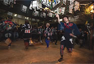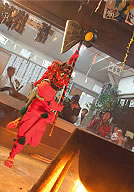 The Oni (ogres) who appear in the Hana Matsuri are called “Yamami Oni” “Sasaki Oni” “Asa Oni” wearing big masks, straw sandals in red costumes, holding large broadaxes in his hand dancing around the iron pot followed by the follower ogres trampling evil spirits with powerful steps. As the festival proceeds, the spectators shout out “Dance, teehohe, tehohe” to the dancers and in the Maido the God, dancers and spectators became united reaching the climax.